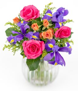 A bright and beautiful mix of hot pink, orange and purple blooms. Delicate orange roses, bold iris, sunny solidago and hot pink roses are carefully selected and packed by hand in specially designed packaging that fits through the letterbox. The flowers arrive in bud, and with just a splash of water and our included flower food, the blooms will gradually open up within two days, revealing their beautiful final form. And with tracked delivery, you can track the progress of your vibrant bouquet, knowing exactly when the surprise reaches your loved one. Unforgettable beauty at a unbeatable price.