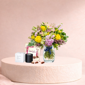 A vibrant bouquet in joyful yellow and pink tones, paired with our signature No.55 candle and classic Dairy Box chocolates. A bright and thoughtful Mother’s Day gift. Including a vibrant arrangement full of warmth and colour created exclusively by our skilled florists paired with our exclusive No.55 candle. A signature scent named after our flagship store at 55 Park Road, where Flower Station began over 20 years ago. Handcrafted with delicate notes of berries, geranium, rose and jasmine, it fills any space with a beautifully layered floral fragrance created by those who know flowers best. For some extra sweetness, also find a box of classic Dairy Box chocolates helping create a beautiful balance of fragrance, sweetness and celebration. There’s always a reason to remind someone how much they matter and this radiant gift set does exactly that. Standard size includes: 5 pink stocks, 5 white/pink alstroemerias, 5 African yellow roses, yellow solidago and pink limonium with seasonal foliage.