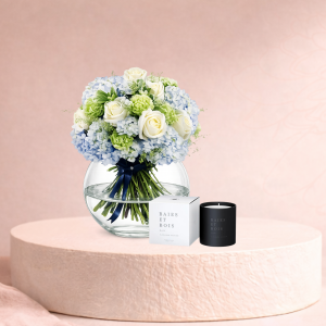 A striking bouquet of blue hydrangeas and white roses paired with our signature No.55 candle. Bold, elegant, and unforgettable for Mother’s Day. The Divine bouquet is designed to impress. Composed of rich blue hydrangeas, white Avalanche roses, green dianthus, and lush seasonal foliage, it creates a beautifully balanced arrangement full of texture and depth. Completing the gift is our exclusive No.55 candle. A signature scent named after our flagship store at 55 Park Road, where Flower Station began over 20 years ago. Handcrafted with delicate notes of berries, geranium, rose and jasmine, it fills any space with a beautifully layered floral fragrance created by those who know flowers best. Elegant and expressive, this set is a wonderful way to celebrate Mums. Standard size includes: 5 blue select hydrangeas, 5 African white roses, 7 green carnations, Pittosporum and Greenbell.