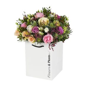 Soft roses and papery eustoma are grounded by the electric texture of thistle and the hazy, coastal drift of limonium, finished with seasonal foliage for a bouquet that feels like the very edge of summer.